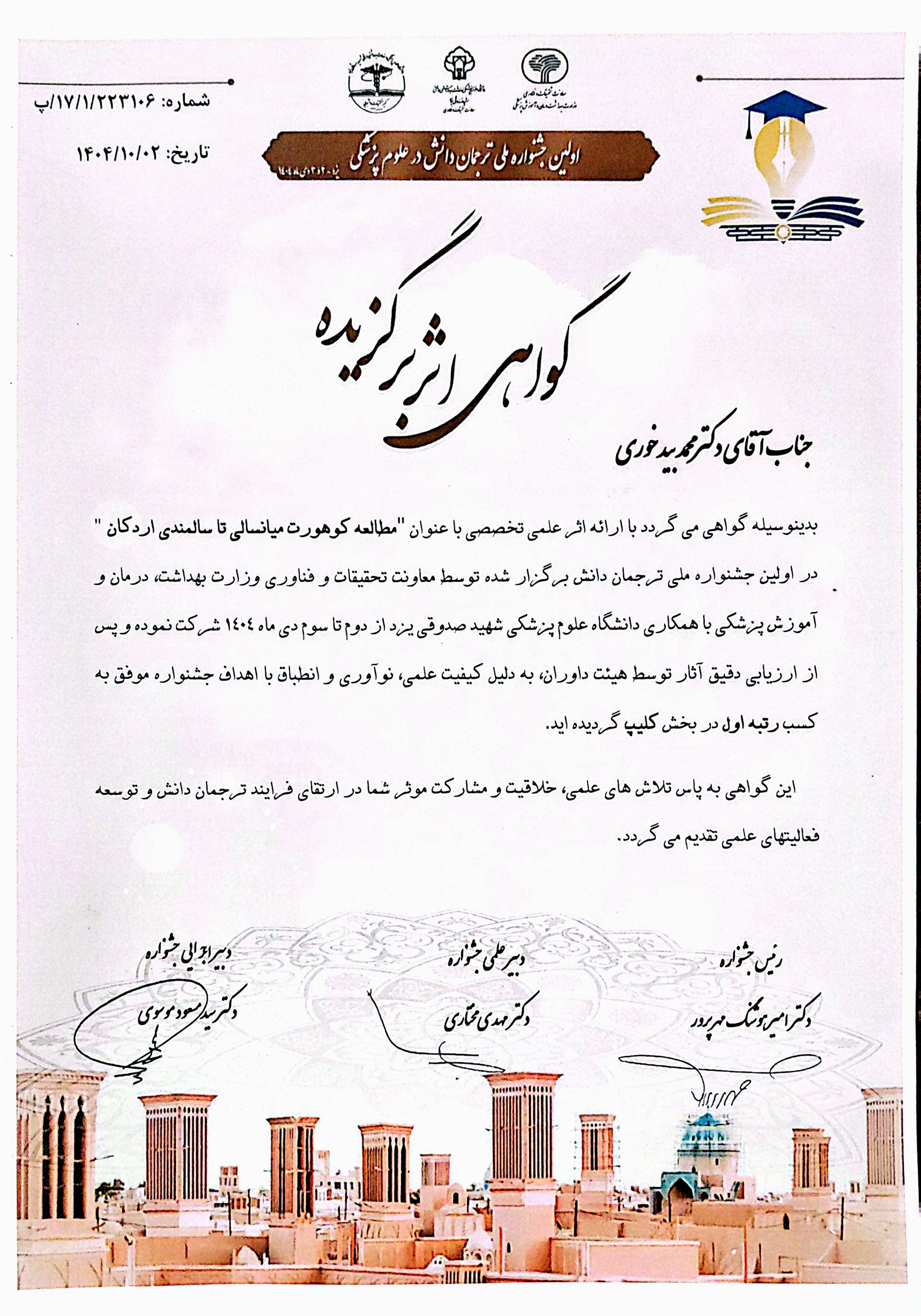در پایان، دکتر دلبری تأکید کرد که این موفقیت، مرهون تعهد و استمرار همکاری علمی تمام همکاران پرتلاش پروژه کوهورت است که طی حدود هفت سال گذشته، از روزهای آغازین پروژه در سال ۱۳۹۸، با این مرکز همراه بوده‌اند و برای تمام همکاران ارجمند، تداوم این مسیر افتخارآفرین را آرزو کرد.