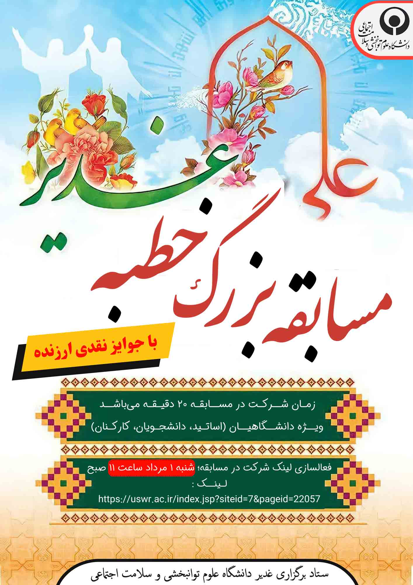 به همت ستاد بزرگداشت غدیر دانشگاه علوم توانبخشی و سلامت اجتماعی و همراهی و یاری اداره روابط عمومی و اداره فن آوری اطلاعات دانشگاه، مسابقه خطبه غدیر برگزار و اسامی برندگان به ترتیب ذیل اعلام می گردد.
