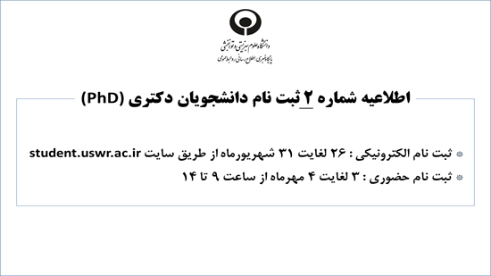 اطلاعیه شماره 2 ثبت نام دانشجویان دکتری (PhD)