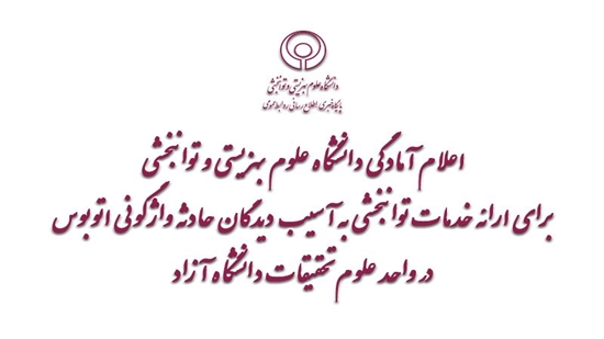 با سلام و تقدیم احترام، بدینوسیله ضمن ابراز تاسف از حادثه واژگونی اتوبوس حامل دانشجویان واحد علوم تحقیقات و تسلیت به خانواده جان باختگان، دانشجویان و همکاران آن دانشگاه و آرزوی شفای عاجل برای حادثه دیدگان، اعلام آمادگی می نماید تا در صورت نیاز، به آسیب دیدگان بویژه در فرآیند توانبخشی ضایعات ایجاد شده در مرحله بعد از جراحی و تحت حاد، ارائه خدمات نماید.