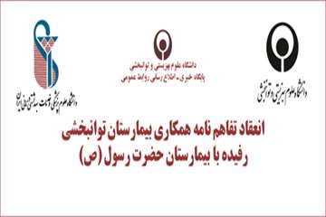 تفاهم نامه همکاری بیمارستان توانبخشی "رفیده " از جمله بیمارستانهای تحت پوشش دانشگاه علوم بهزیستی و توانبخشی با بیمارستان حضرت رسول (ص) از بیمارستانهای دانشگاه علوم پزشکی ایران ، منعقد شد.