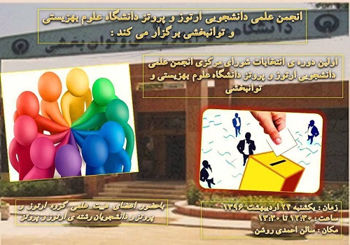 اولین دوره انتخابات شورای مرکزی انجمن علمی _ دانشجویی ارتز و پروتز دانشگاه علوم بهزیستی و توانبخشی با همکاری اداره تعالی فرهنگی و فوق برنامه ی معاونت فرهنگی و دانشجویی، در روز یکشنبه ۲۴ اردیبهشت ۱۳۹۶ در سالن شهید مصطفی احمدی روشن برگزار می شود.