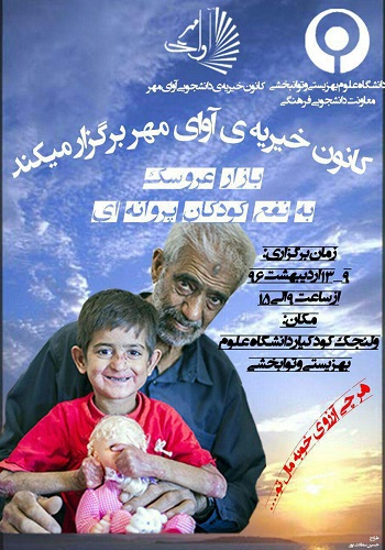 کانون خیریه آوای مهر که یکی از کانون ها و تشکل های دانشجویی این دانشگاه است  با همکاری معاونت فرهنگی – دانشجویی دانشگاه علوم بهزیستی و توانبخشی، اقدام به برگزاری بازارچه خیریه عروسک کرده  تا با عواید حاصل از فروش عروسک ها، بتواند لبخندی بر لبان کودکان پروانه ای (EB) بنشاند.