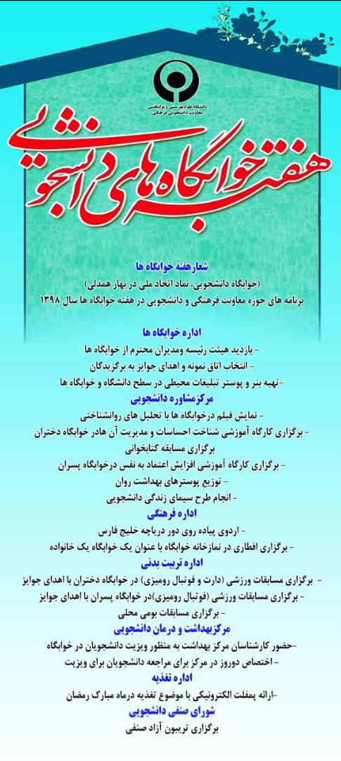 اقدم، افزود: برپایی سفرههای افطاری و انتخاب اتاق نمونه در خوابگاههای دانشجویی، و بازدید دانشجویان از دریاچه شهدای خلیج فارس، نیز از دیگر برنامه های هفته خوابگاه ها بود که با همکاری مدیریت فرهنگی دانشگاه اجرا شد.