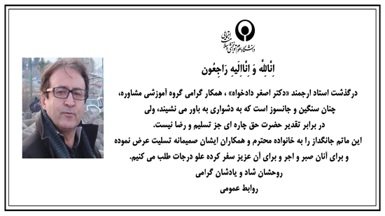 روابط عمومی دانشگاه ، درگذشت استاد ارجمند «اصغر دادخواه» را به همکاران و خانواده ایشان تسلیت عرض می نماید.
