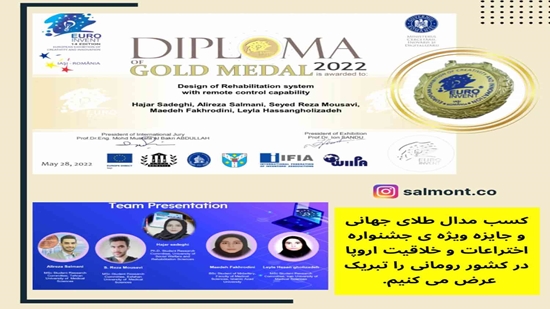 هاجر صادقی دانشجوی دکتری تخصصی پرستاری دانشگاه علوم توانبخشی و سلامت اجتماعی و تیم همکارش با ارائه اختراع « طراحی سیستم توانبخشی با قابلیت کنترل از راه دور »، به جشنواره اختراعات و خلاقیت اروپا که در کشور رومانی برگزار شد، مدال طلا و جایزه ویژه این جشنواره را دریافت کردند.