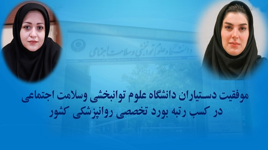 دو تن از دستیاران روانپزشکی دانشگاه علوم توانبخشی و سلامت اجتماعی در آزمون بورد تخصصی این رشته، جزو 5% و 10% این آزمون کشوری معرفی شدند.