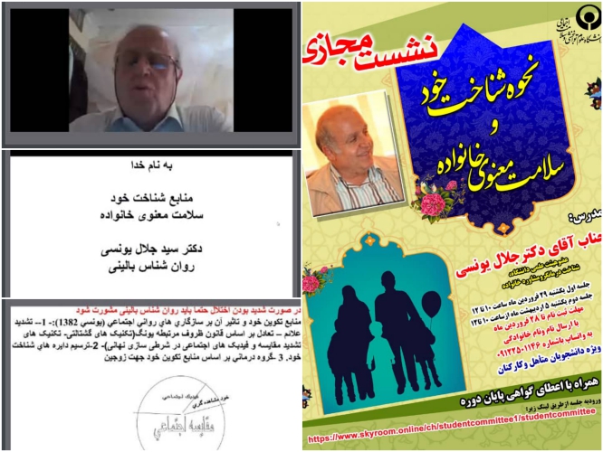 دکتر جلال یونسی عضو هیات علمی گروه مشاوره دانشگاه علوم توانبخشی و سلامت اجتماعی در وبینار « نحوه شناخت خود و سلامت معنوی خانواده » از ویژه برنامه های فصل رویش ماه مبارک رمضان گفت: خودمشاهده گری صحیح، یکی از راههای شناخت خدا و یکی از عوامل سلامت معنوی و سلامت روان است .