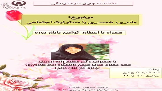 نشست مجازی « سبک زندگی فاطمی (س) »، با محوریت " مادری، همسری یا مسئولیت اجتماعی؟" به مناسبت ولادت حضرت فاطمه زهرا (س) و گرامی داشت مقام زن و مادر، با مشارکت دفتر امور بانوان دانشگاه و واحد خواهران دفتر نهاد مقام معظم رهبری در دانشگاه، برای کارکنان خانم برگزار شد .