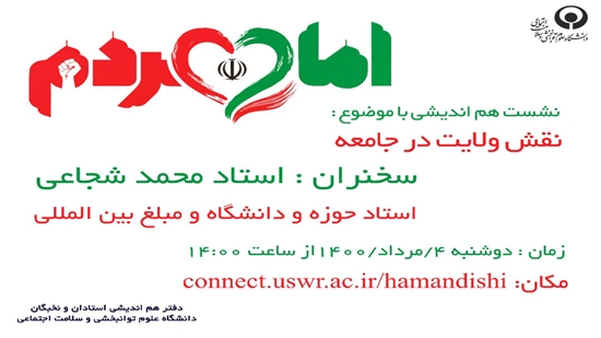 نشست مجازی هم اندیشی با موضوع « نقش ولایت در جامعه » روز دوشنبه به همت دفتر هم اندیشی استادان و نخبگان دانشگاه علوم توانبخشی و سلامت اجتماعی و با ارائه " محمد شجاعی " استاد حوزه و دانشگاه و مبلغ بین المللی برگزار شد.