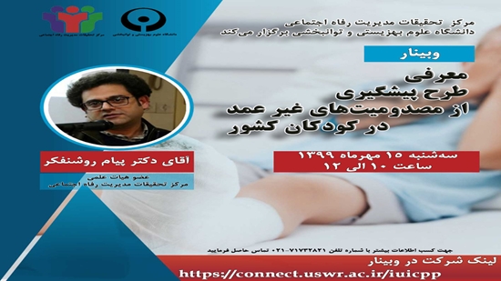 وبینار « معرفی طرح پیشگیری از مصدومیت های غیرعمد در کودکان کشور » روز سه شنبه 15 مهرماه به همت مرکز تحقیقات مدیریت رفاه اجتماعی دانشگاه علوم بهزیستی و توانبخشی برگزار می شود.