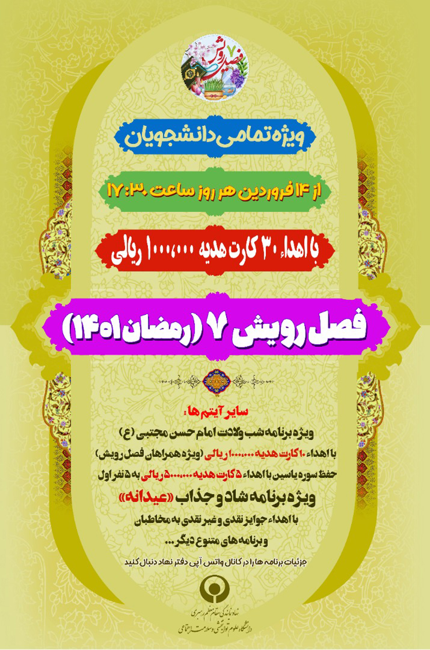 به گزارش وبدای دانشگاه بنقل از روابط عمومی دفتر نهاد مقام معظم رهبری در دانشگاه، فصل رویش ۷ ، با محوریت قرآن، مهدویت، نماز و با شعار بصیرت، امید، آرامش در سه دهه ماه مبارک رمضان میزبان دانشجویان دانشگاه می باشد.