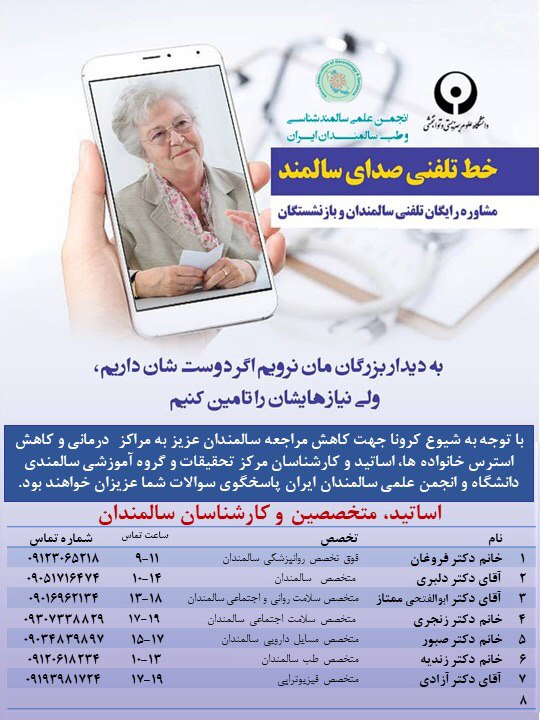 وی تصریح کرد که این پویش هم اکنون از توان حرفه ای و تخصصی جمعی از اساتید و متخصصان حوزه سالمندان و طب سالمندی بهره مند شده است تا بصورت غیرحضوری و از طریق " تلفن "، بتوانند به سالمندان نیازمند به خدمات مشاوره روانشناختی و اجتماعی، ارائه خدمت نمایند.