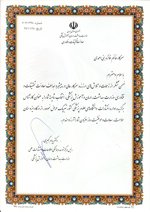 " فائزه بنی احمدی " کارشناس بخش انتشارات دانشگاه علوم بهزیستی و توانبخشی به عنوان نفر اول کارشناسان برگزیده انتشارات دانشگاه های علوم پزشکی کشور انتخاب شد.
