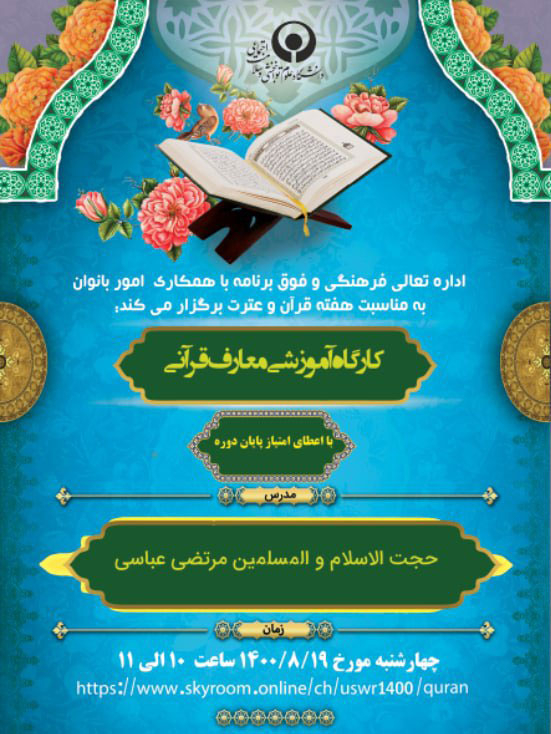 کارگاه آموزشی‌ "معارف قرآنی "، به همت اداره تعالی فرهنگی و فوق برنامه دانشگاه علوم توانبخشی و سلامت اجتماعی و با همکاری امور بانوان این دانشگاه، به صورت مجازی برگزار شد.