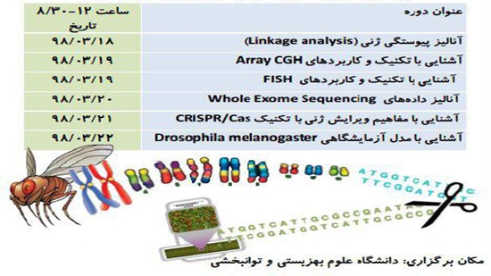 این گزارش همچنین حاکیست، 150 تن از دانشجویان دانشگاه های سراسر کشور که برای شرکت در این کارگاه ها ثبت نام کرده اند، طی پنج روز (18 لغایت 22 خردادماه جاری)، مباحث علمی با محوریت موضوع های " آنالیز پیوستگی ژنی (Linkage analysis)، آشنایی با تکنیک و کاربردهای (Array CGH)، آشنایی با تکنیک و کاربردهای (FISH)، آنالیز داده های (Whole Exome Sequencing)، آشنایی با مفاهیم ویرایش ژنی با تکنیک (CRISPR Cas)، آشنایی با مدل آزمایشگاهی (Drosophila Melanogaster) " را آموزش می بینند.