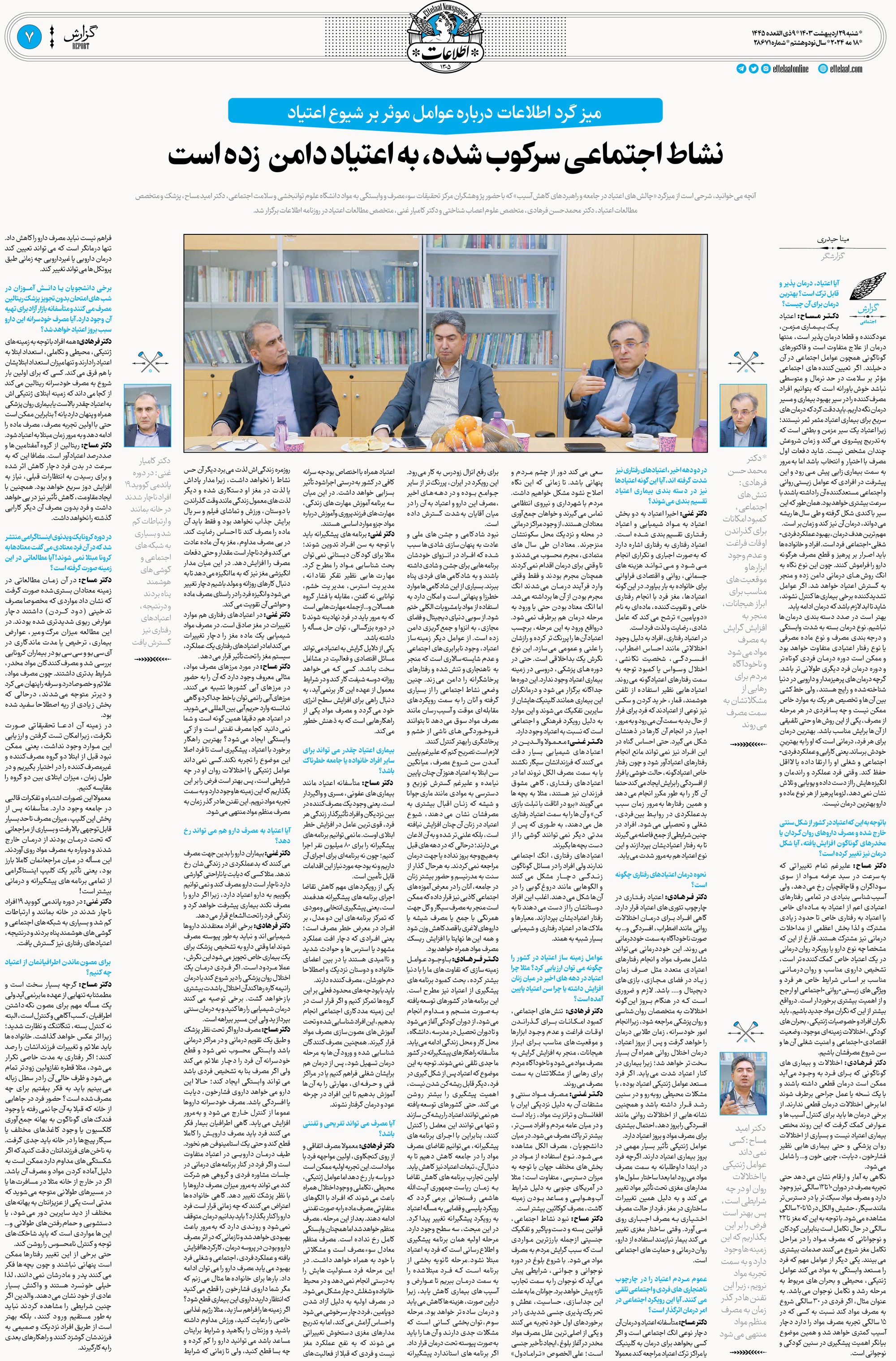 به گزارش روابط عمومی دانشگاه علوم توانبخشی و سلامت اجتماعی، به نقل از روزنامه اطلاعات ، میزگرد «چالش‌های اعتیاد در جامعه و راهبردهای کاهش آسیب» با حضور پژوهشگران مرکز تحقیقات سوءمصرف و وابستگی به مواد دانشگاه علوم توانبخشی و سلامت اجتماعی، دکتر امید مساح، پزشک و متخصص مطالعات اعتیاد، دکتر محمدحسن فرهادی، متخصص علوم اعصاب شناختی و دکتر کامیار غنی، متخصص  مطالعات اعتیاد در روزنامه اطلاعات برگزار شد و در نظر داریم در هفته ملی بدون دخانیات که  از 5 تا 11 خرداد 1403 با تاکید بر حفاظت از کودکان در برابر مداخلات صنعت دخانیات و شعار «حفاظت از کودکان و نوجوانان در برابر دخانیات، حق و مسئولیت همگانی» نامگذاری شد، نظرات تخصصی کارشناسان این حوزه را به اطلاع مخاطبان برسانیم.