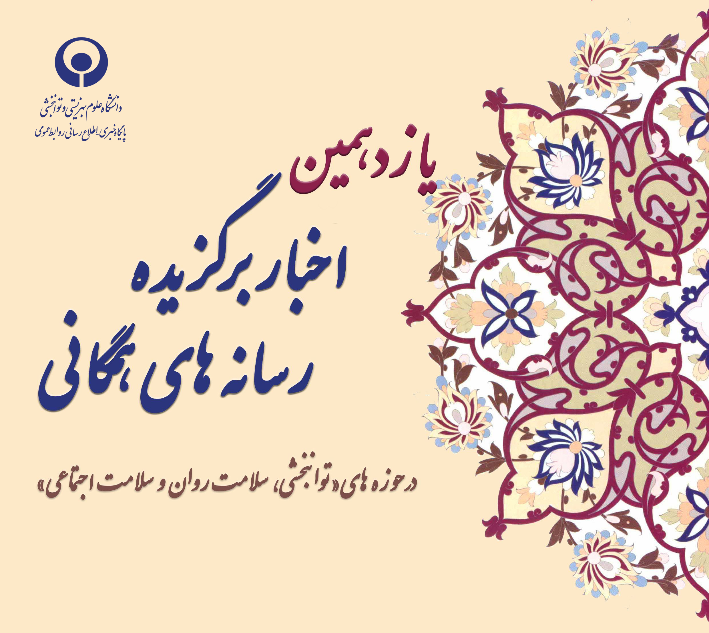 روابط عمومی دانشگاه علوم بهزیستی و توانبخشی، امروز (سه شنبه) یازدهمین مجموعه از مهمترین اخبار رسانه های همگانی مربوط به سه حوزه سلامت ( توانبخشی ، سلامت روان ، سلامت و رفاه اجتماعی ) را منتشر کرد.
