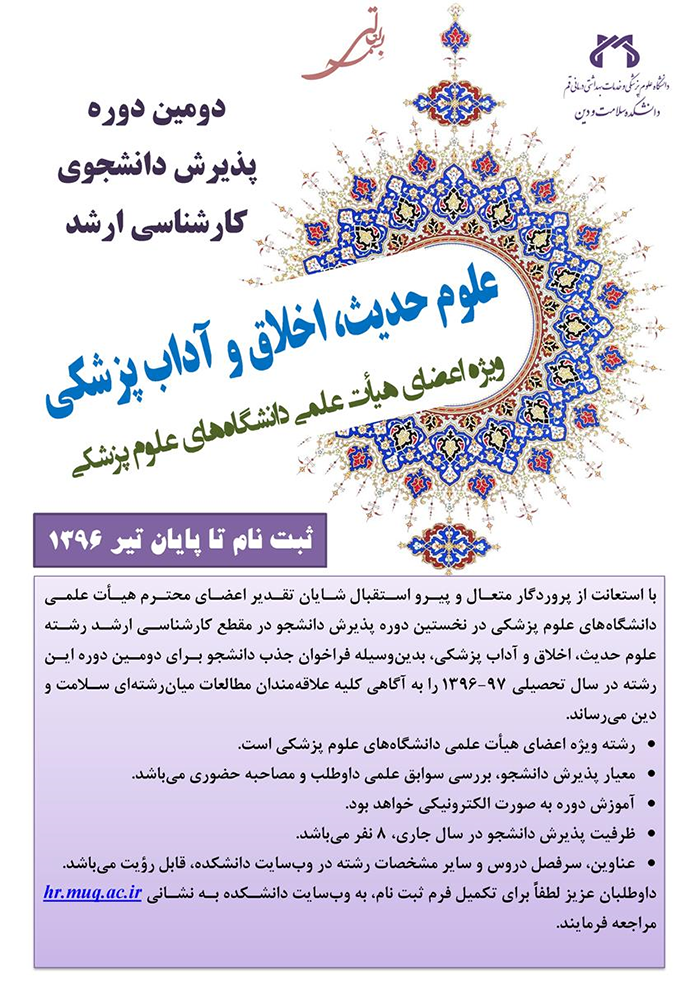 دومین دوره پذیرش دانشجوی کارشناسی ارشد علوم حدیث، اخلاق و آداب پزشکی دانشکده سلامت و دین ... گروه خبری : اطلاعیه ها کد خبر : 10408