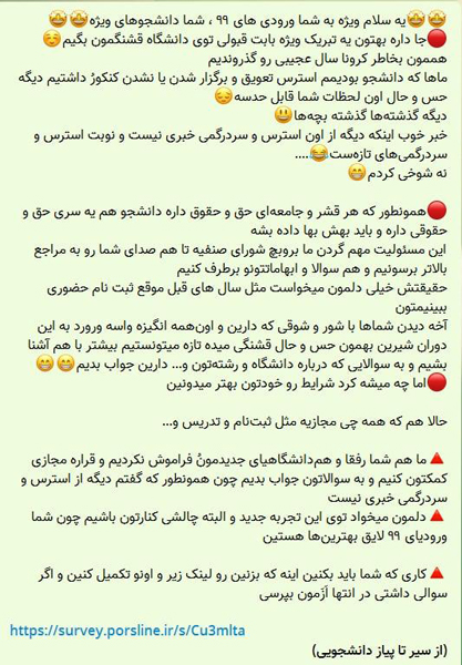 براساس این اطلاعیه، لینک  http://survey.porsline.ir/s/Cu3mlta   برای برقراری ارتباط با دانشجویان جدید الورود دانشگاه و تقسیم بندی آنان براساس رشته تحصیلی و شرایط هر یک، جهت همراهی بهتر و مناسب تر، اعلام شده است.