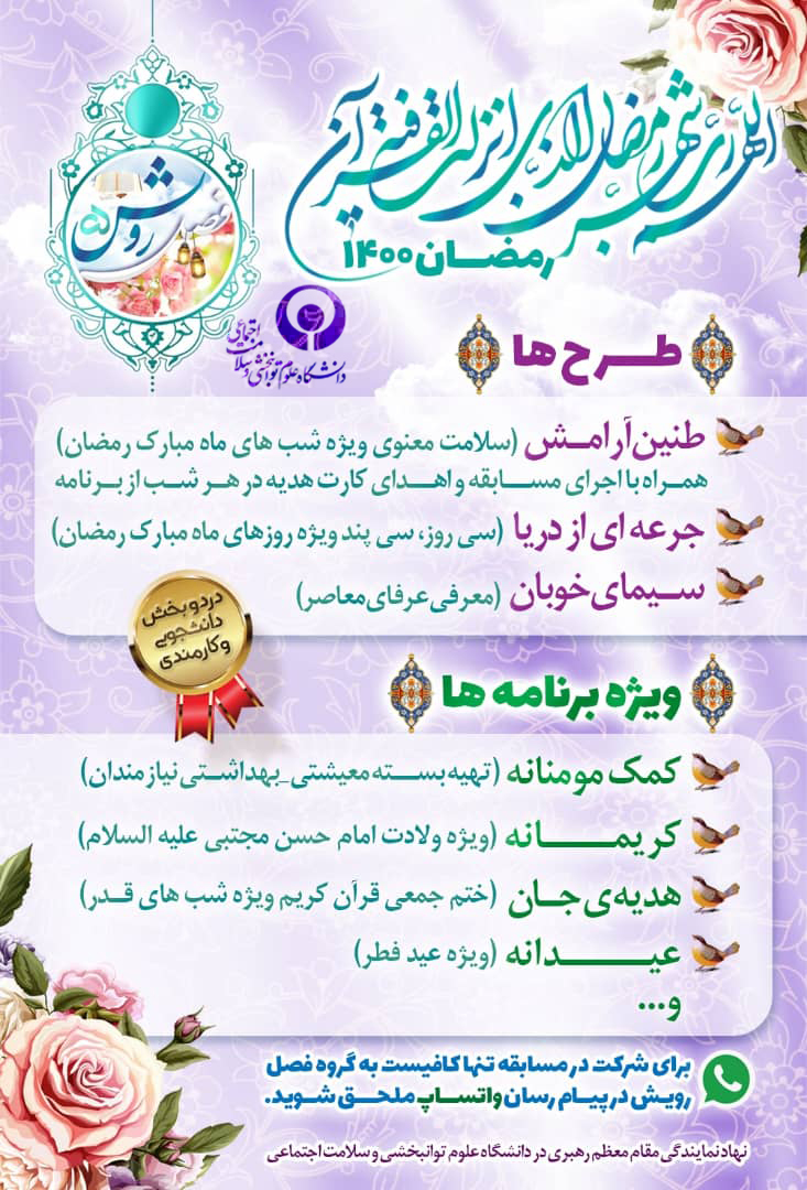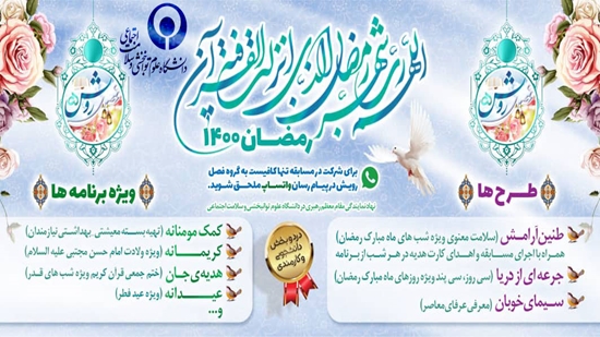 فصل رویش (5) ویژه ماه مبارک رمضان با ارائه محتواهای دینی، فرهنگی و ... در بستر فضای مجازی برای خانواده بزرگ دانشگاه علوم توانبخشی و سلامت اجتماعی برگزار خواهد شد.