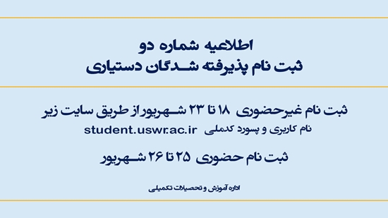 همچنین در تاریخ 25/6/ 1403 و 1403/6/26 از طریق مراجعه حضوری تمامی مدارک ثبت نامی خود را به دانشگاه تحویل نمایند.
