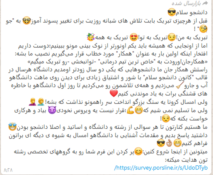 کانون دانشجو سلام ، لینک https://survey.porsline.ir/s/UdoDTyb/ را برای برقراری ارتباط با دانشجویان جدید الورود دانشگاه و تقسیم بندی آنان براساس رشته تحصیلی و شرایط هریک، جهت همراهی بهتر و مناسب تر، اعلام کرده است.