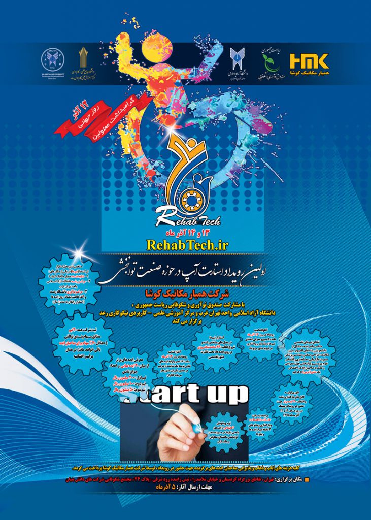 اولین استارت آپ حوزه صنعت توانبخشی سالمندان، معلولین و جانبازان، 13 و 14 آذر ماه 1398 در محل مجتمع های شکوفایی شرکت های دانش بنیان برگزار می شود.