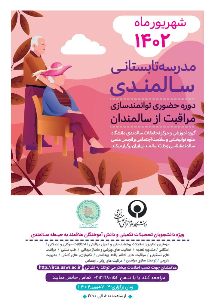 اولین دوره حضوری توانمندسازی مراقبت از سالمندان، به همت گروه آموزشی و مرکز تحقیقات سالمندی دانشگاه علوم توانبخشی و سلامت اجتماعی و انجمن علمی سالمندشناسی و طب سالمندان ایران، تحت عنوان مدرسه تابستانی سالمندی، برگزار می شود.