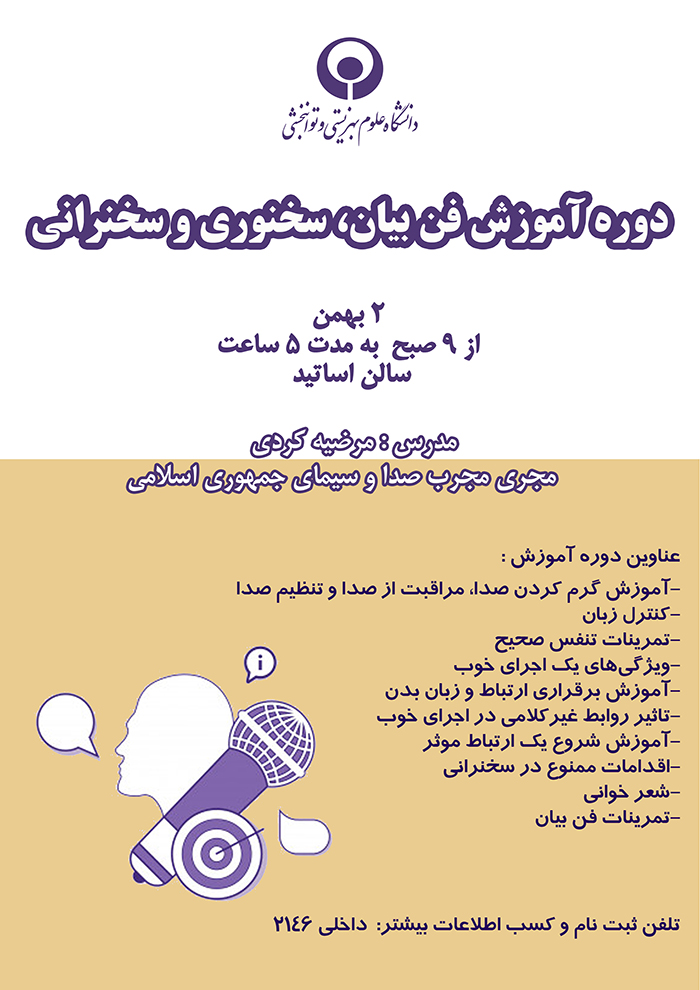 دوره آموزشی « فن بیان، سخنوری و سخنرانی »، روز چهارشنبه (دوم بهمن ماه) از ساعت 9 صبح به همت روابط عمومی دانشگاه علوم بهزیستی و توانبخشی، در سالن اساتید (ساختمان غدیر) دانشگاه برگزار میشود.
