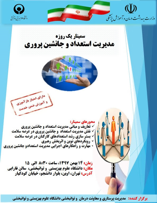 سمینار یک روزه مدیریت استعداد و جانشین پروری ، روز یکشنبه 14 بهمن ماه ، به همت مدیریت پرستاری معاونت درمان دانشگاه علوم بهزیستی و توانبخشی ، از ساعت 8 تا 15 در سالن فارابی برگزار می شود.