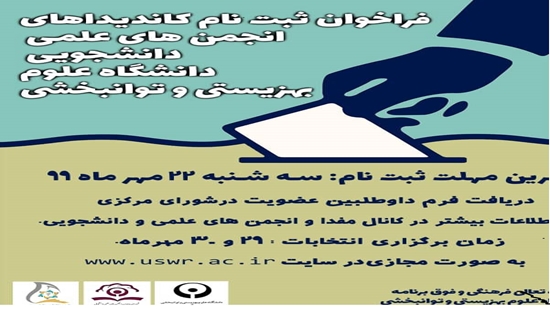 این گزارش همچنین حاکیست، انتخابات در تاریخ های  29 و 30 مهر ماه 99 در سایت دانشگاه به آدرس  www.uswr.ac.ir ، و بصورت مجازی برگزار خواهد شد.