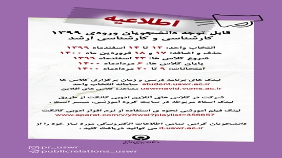 قابل توجه دانشجویان ورودی 1399 کارشناسی و کارشناسی ارشد / تاریخ انتخاب واحد 12 تا 14 اسفندماه جاری