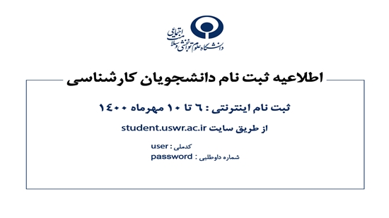 پذیرفته شدگان مقطع کارشناسی 1400 جهت ثبت نام اینترنتی از تاریخ 1400/7/6 لغایت 1400/7/10 (ساعت 9صبح) از طریق مراجعه به سایت :student.uswr.ac.ir با userکدملی و password شماره داوطلبی می باشد. و آپلود مدارک مورد نیاز ثبت نام اینترنی خود را کامل کرده ودر پایان شماره دانشجویی دریافت نمایند.