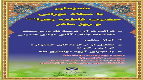 به گزارش وبدای دانشگاه علوم بهزیستی و توانبخشی، همزمان با میلاد نورانی حضرت فاطمه زهرا (س) و روز مادر، محفل انس با قرآن، تقدیر از برگزیدگان مرحله دانشگاهی با اجرای گروه تواشیح طه ، برگزار خواهد شد.