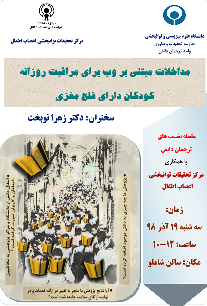 نشست علمی « مداخلات مبتنی بر وب برای مراقبت روزانه کودکان دارای فلج مغزی »، روز سه شنبه ( 19 آذرماه جاری ) در سالن دکتر شاملو دانشگاه علوم بهزیستی و توانبخشی برگزار می شود.
