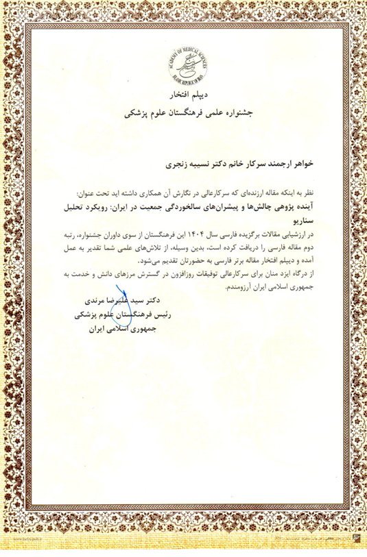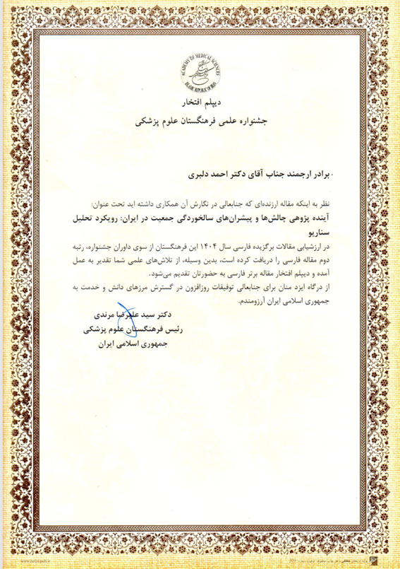 دکتر ممتاز گفت: در بخش جایزه مقاله برتر فارسی از دکتر نسیبه زنجری و دکتر احمد دلبری به همراه سایر همکاران در نگارش مقاله "آینده پژوهی چالش ها و پیشران های سالخوردگی جمعیت در ایران: رویکرد تحلیل سناریو" چاپ شده در "مجله سالمندی ایران" در سال 1403 به عنوان رتبه دوم با اهداء دیپلم افتخار و لوح سپاس تجلیل و قدردانی شد.