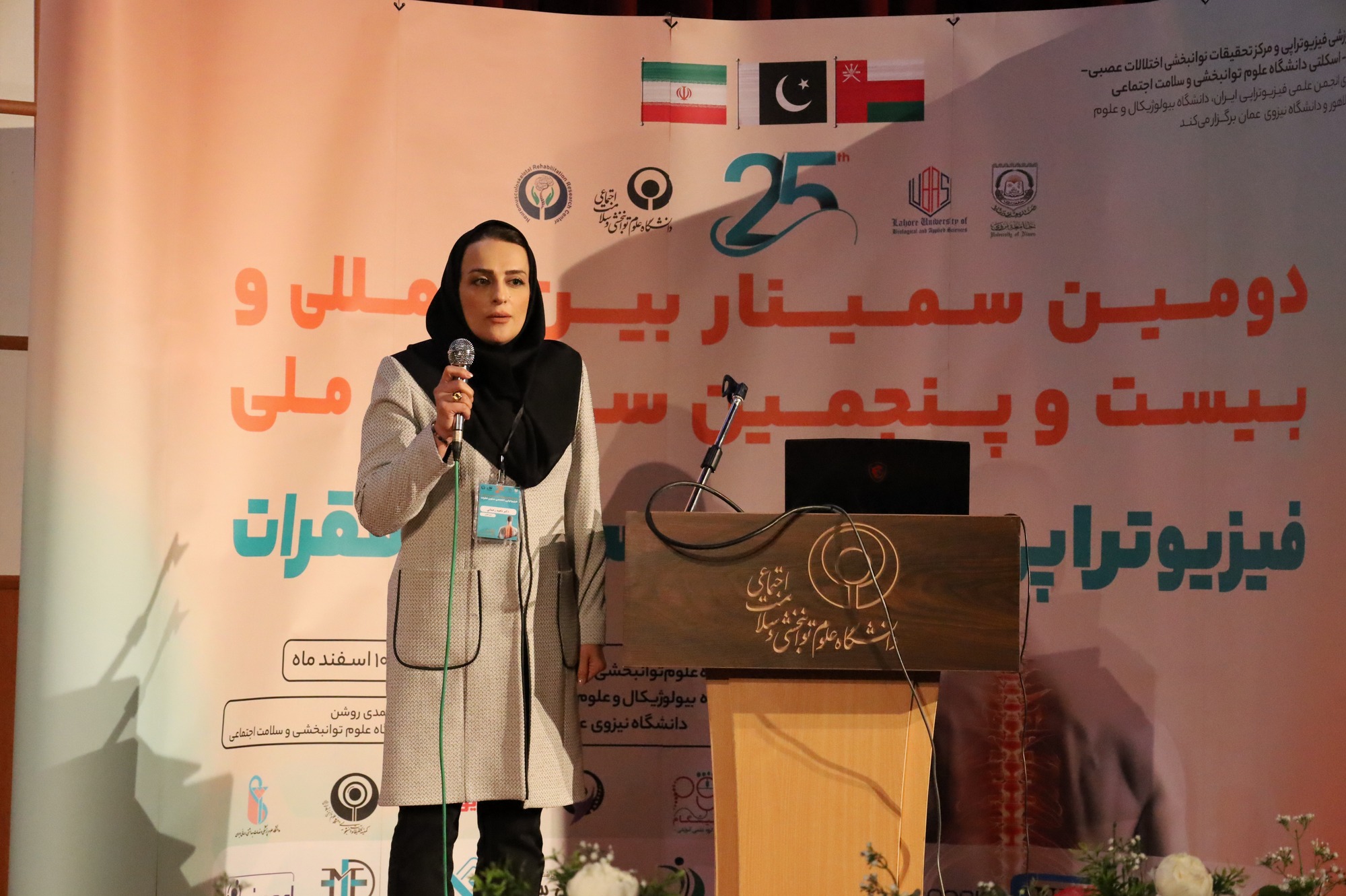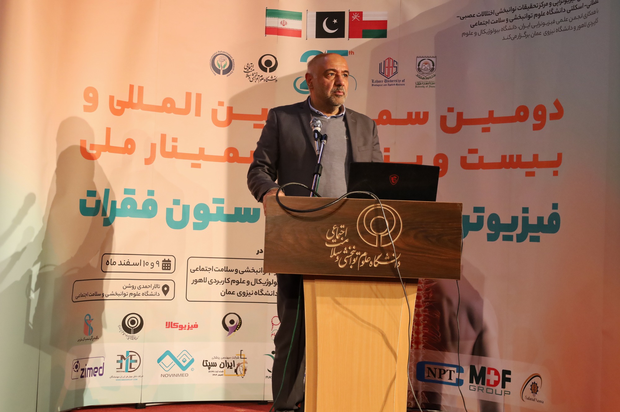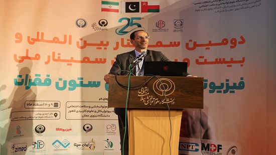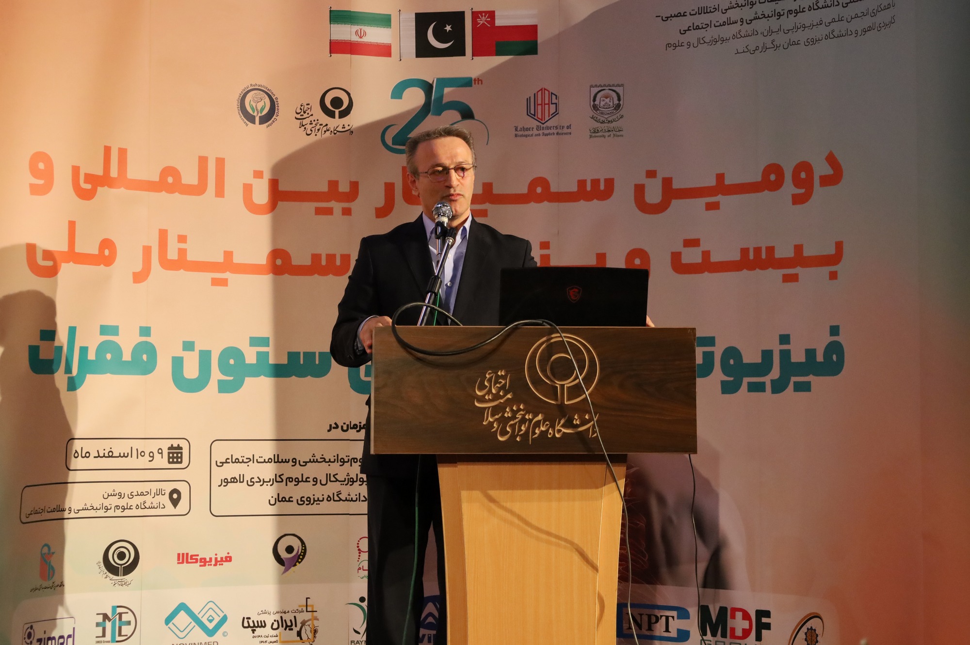 رئیس دومین سمینار بین‌المللی و بیست و پنجمین سمینار ملی فیزیوتراپی تخصصی ستون فقرات در ادامه اظهار کرد: از دکتر سید علی حسینی رئیس دانشگاه علوم توانبخشی و سلامت اجتماعی، دکتر محمدعلی محسنی بندپی معاون پارلمانی وزارت تعاون، کار و رفاه اجتماعی جمهوری اسلامی ایران، دکتر ابراهیم احمد الخروصی مدیر کالج توانبخشی و علوم پزشکی وابسته دانشگاه نزوا، دکتر اسماعیل ابراهیمی رئیس هیئت فیزیوتراپی وزارت بهداشت، درمان و آموزش پزشکی جمهوری اسلامی ایران و رئیس انجمن فیزیوتراپی ایران، دکتر ایرج عبداللهی صمیمانه قدردانی می‌کنم.
