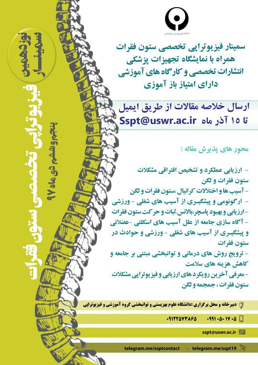 نوزدهمین سمینار فیزیوتراپی تخصصی ستون فقرات، روز چهارشنبه در دانشگاه علوم بهزیستی و توانبخشی برگزار می شود