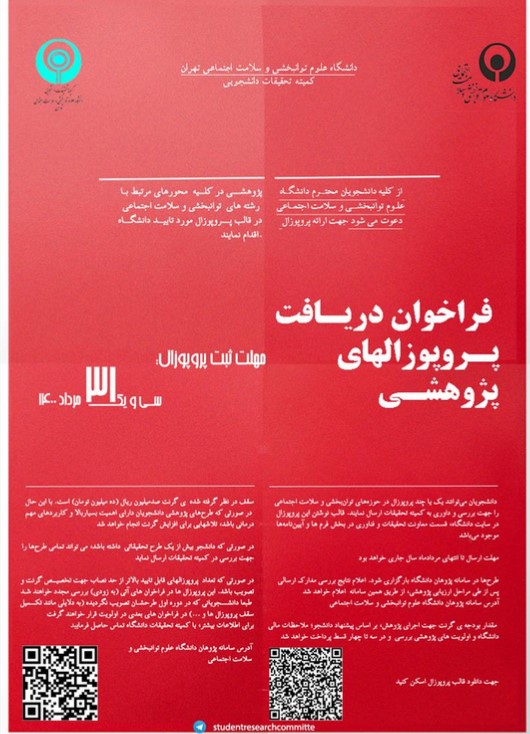 کمیته تحقیقات دانشجویی دانشگاه علوم توانبخشی و سلامت اجتماعی از همه دانشجویان دانشگاه دعوت کرد، جهت ارائه پروپوزال پژوهشی در کلیه محورهای مرتبط با رشته های توانبخشی و سلامت اجتماعی در قالب پروپوزال مورد تایید دانشگاه، تا تاریخ 31 مردادماه 1400 اقدام کنند.