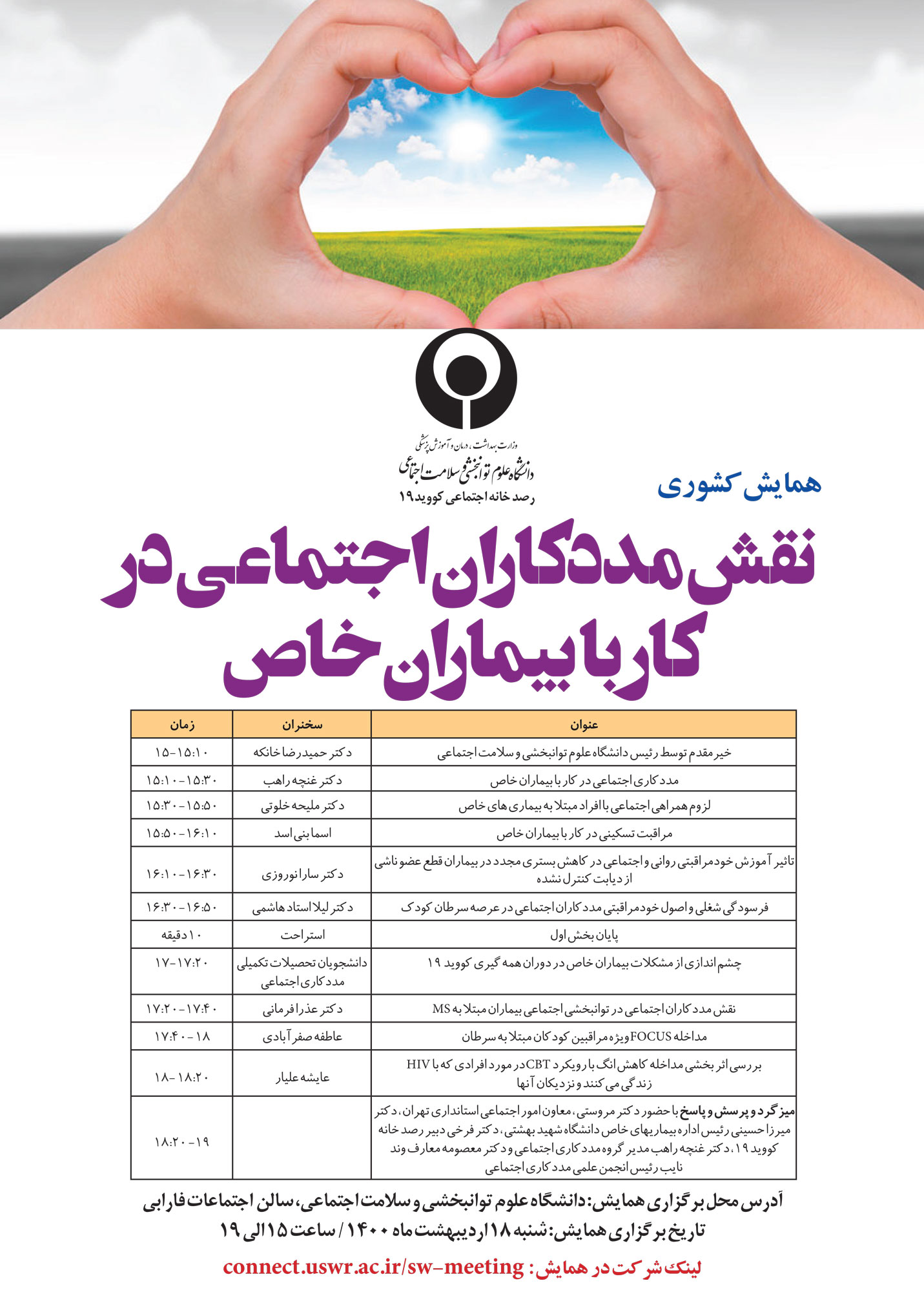 در بخشی از این همایش، « چشم اندازی از مشکلات بیماران خاص در دوران همه گیری کووید 19 » توسط دانشجویان تحصیلات تکمیلی مددکاری اجتماعی دانشگاه علوم توانبخشی و سلامت اجتماعی ارائه خواهد شد.