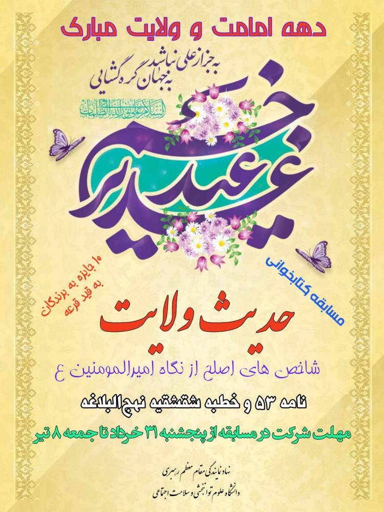 بمناسبت فرارسیدن ایام الله دهه ولایت، دفتر نهاد نمایندگی مقام معظم رهبری در دانشگاه علوم توانبخشی و سلامت اجتماعی مسابقه کتابخوانی حدیث ولایت را برگزار میکند.